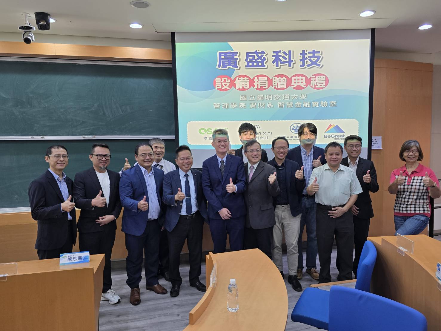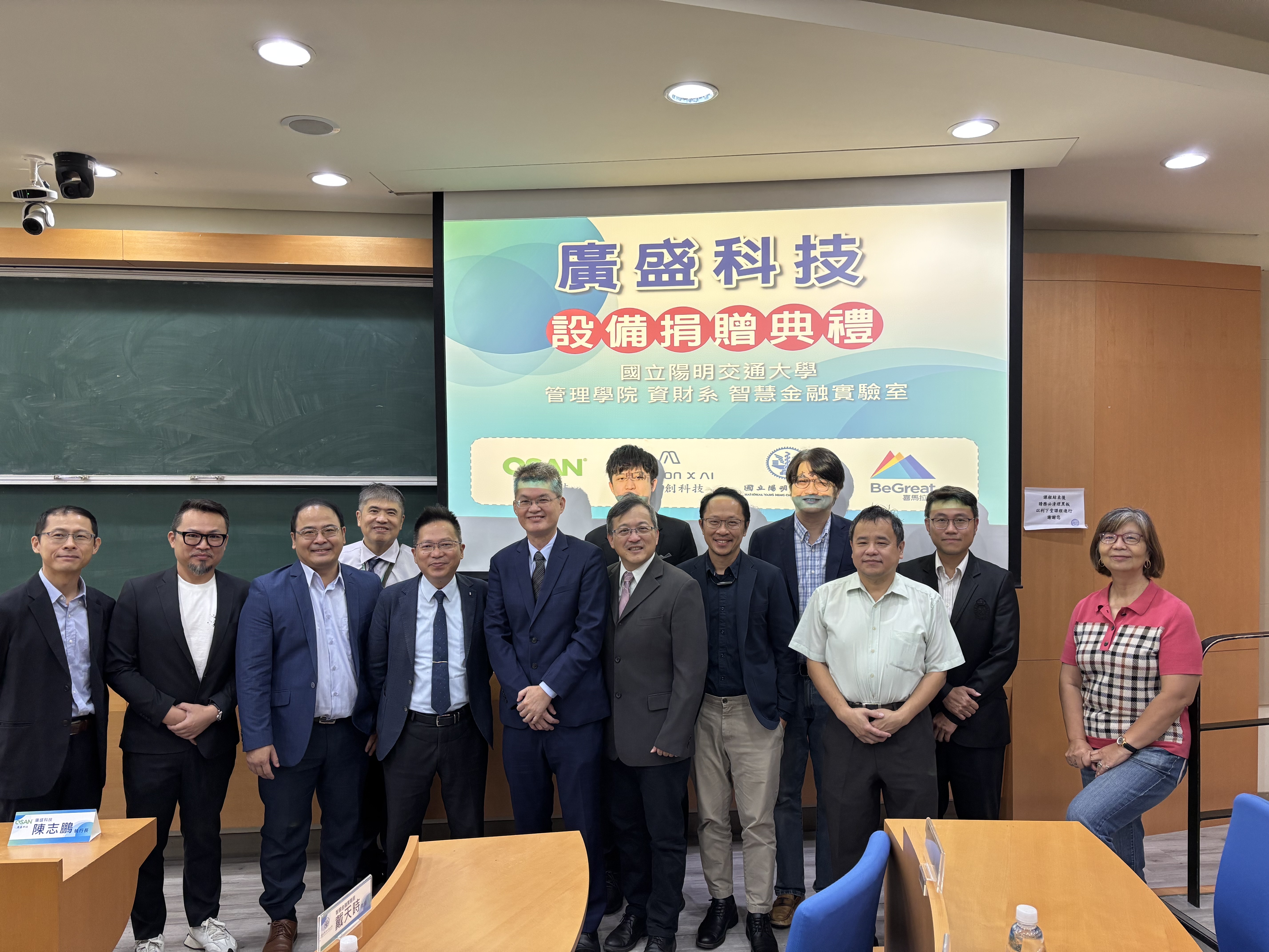 陽明交通大學(24)日舉行廣盛科技設備捐贈儀式,由廣盛科技陳志鵬執行長親臨現場進行捐贈,陽明交通大學管理學院院長邱裕鈞教授代表受贈。此次產學合作,在交大校友所創立的奧斯創科技(ASTRONxAI)牽線下促成,將強化學界在金融科技領域的研發能量,特別是在戴天時教授智慧金融實驗室的研究與教學應用方面。